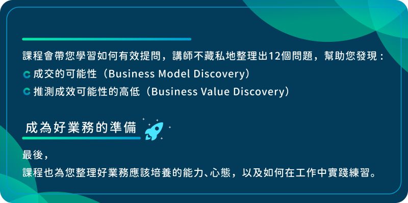 希望學完這堂課後,您能更加了解業務的價值,以及從不同的商業角色中找到定位。
